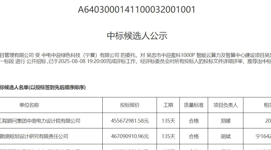 吴忠市中迎盈科1000P智能云算力及智算中心建设项目一标段及二标段中标候选人公示