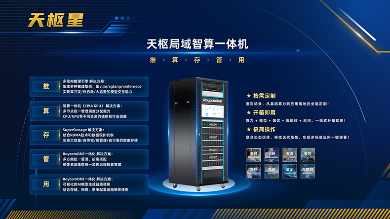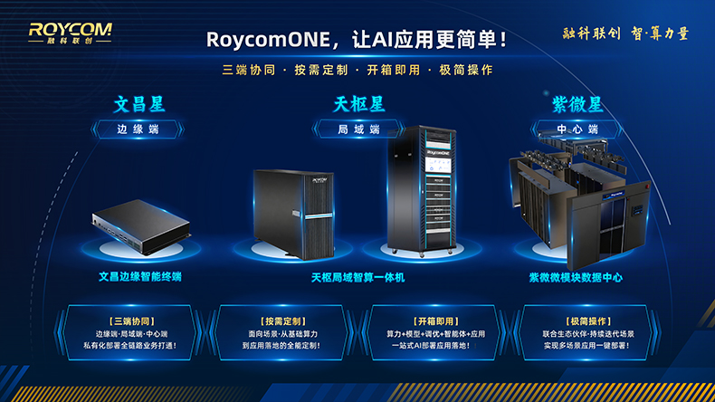 融科联创先后推出人工智能、高性能计算、超融合、存储、信创、液冷、定制化、网络等系列算力产品和智算应用解决方案。面对AI大模型私有化部署需求,重磅推出"RoycomONE智算一体机",打造“文昌边缘智能终端、天枢局域智算一体机、紫微微模块数据中心”三端协同系列场景解决方案,面向场景按需定制,实现本地化推理、再训练、微调等功能,让AI在使用中不断进化,并与合作伙伴共建共赢生态,驱动RoycomONE智算一体机快速迭代,实现“算力+模型+调优+智能体+应用”的一键部署和开箱即用,让AI应用更简单!