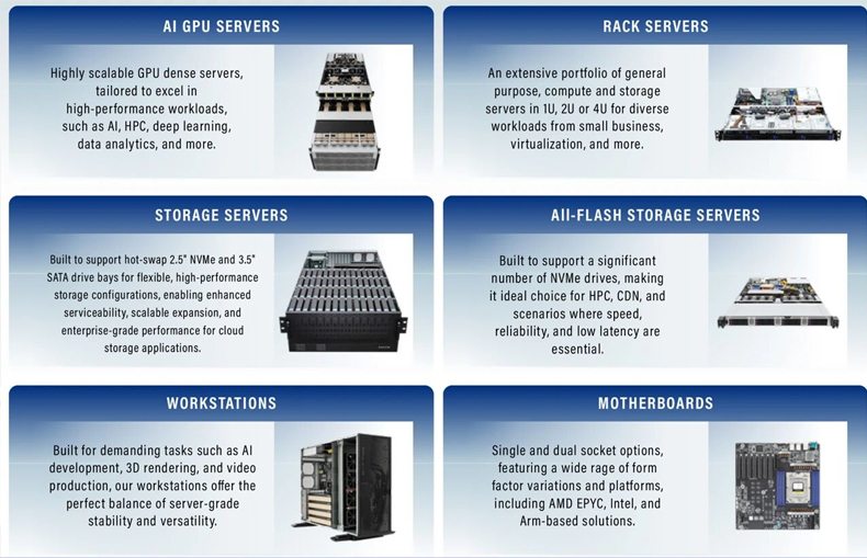 服务器主板:提供 AMD EPYC、Intel、Arm 等多平台单 / 双路方案,覆盖丰富形态因子,为定制化算力构建提供核心支撑。