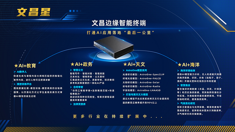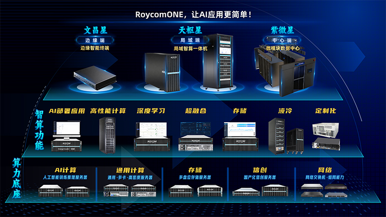 融科联创先后推出人工智能、高性能计算、超融合、存储、信创、液冷、定制化、网络等系列算力产品和智算应用解决方案。面对AI大模型私有化部署需求,重磅推出"RoycomONE智算一体机",打造“文昌边缘智能终端、天枢局域智算一体机、紫微微模块数据中心”三端协同系列场景解决方案,面向场景按需定制,实现本地化推理、再训练、微调等功能,让AI在使用中不断进化,并与合作伙伴共建共赢生态,驱动RoycomONE智算一体机快速迭代,实现“算力+模型+调优+智能体+应用”的一键部署和开箱即用,让AI应用更简单!